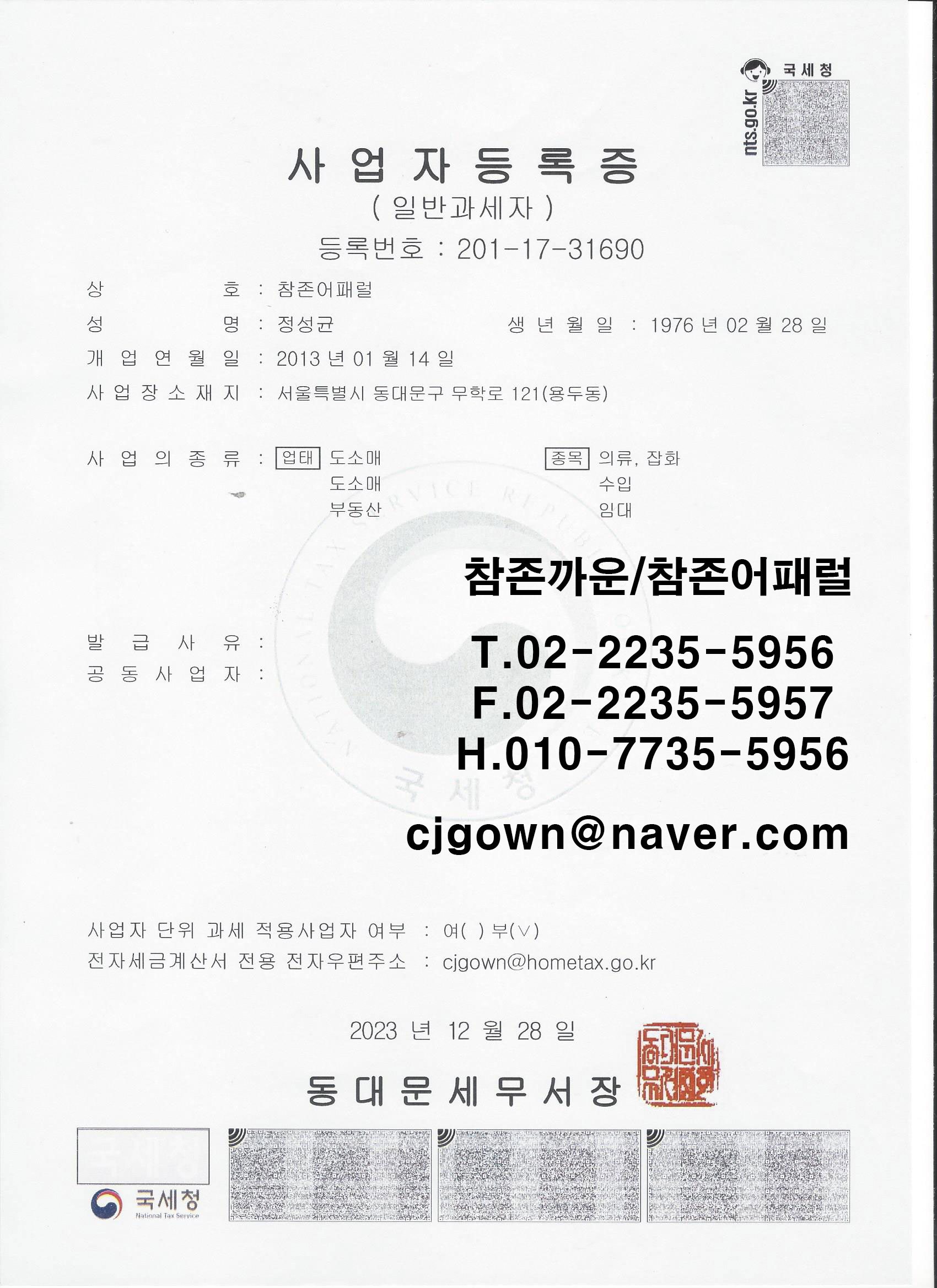 상호: 참존어패럴  | 브랜드 : 참존까운  | 사업자번호: 201-17-31690  | 대표자: 정성균 사업자정보확인