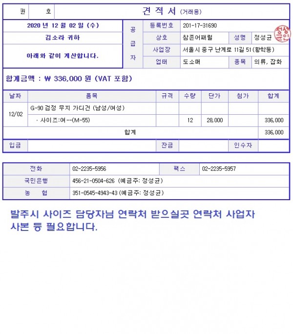 참존입니다. 견적서 드립니다. 인쇄(자수)가 들어갈경우 비용이 달라집니다.
