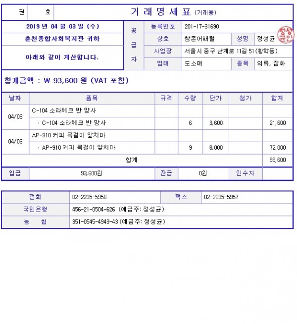 참존까운입니다. 명세서 드립니다. 확인부탁드립니다.