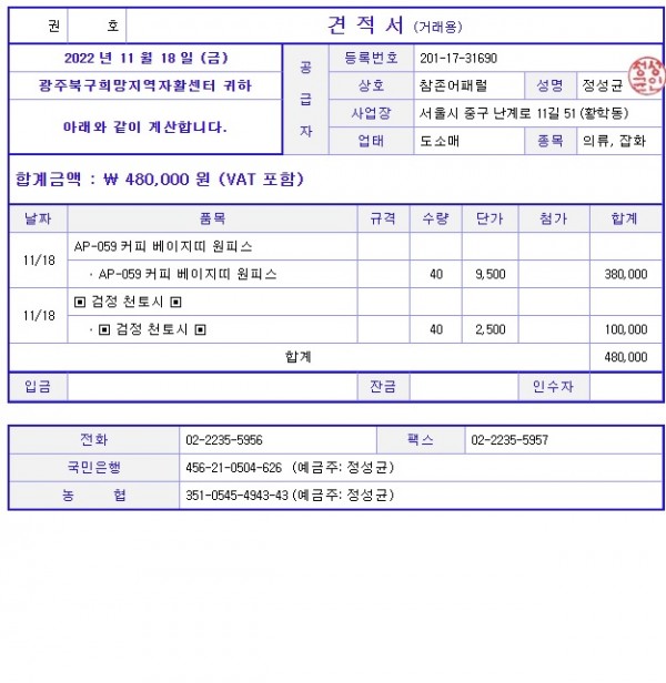 참존입니다. 견적서 메일로도 넣어드리겠습니다. 감사합니다.