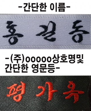 쓰는 사람의 필체로 명찰이름을 새기듯 쓰는 자수입니다.이름자수 설정후 주문시 전달메시지에 들어갈 이름을 써주시고 그렇지 않으면 주문후 연락바랍니다.★ 한벌 주문시 들어갈 이름을 안적어주시면 주문자분 성함으로 작업되져도 책임을 지지 않습니다.