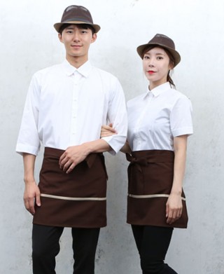 폴리100% 살짝 두꺼운 폴리원단을 사용하여 내구성이 좋으며 카페 주방또는 홀 등 잘 어울리는 곳에서 착용가능합니다.
