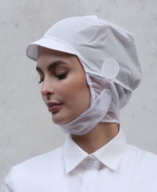 C-140-1 백색 챙부드러운 턱 완망사 위생모자 (마스크고리형) > 식 품 모 자