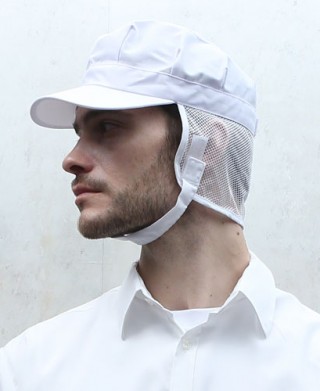 위망사 모자로 통기성이 좋으며 턱끈이 있어 이물질 방지에 도움을 줍니다.