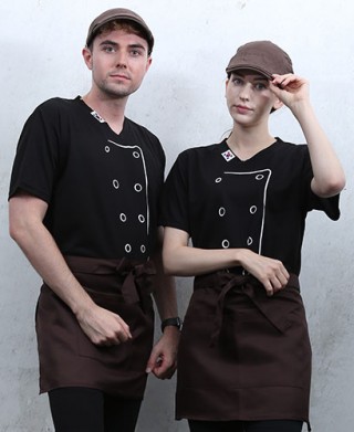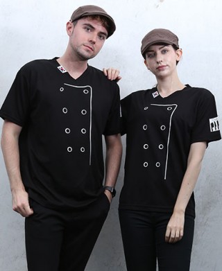 쿨론원단100% 로 앞쪽에 쿡모양과 팔쪽에 프로페셔널 인쇄가 되어있는 티셔츠 쿡복입니다. 더운여름철 티셔츠를 입지 못하는 더운매장에 잘 어울립니다.